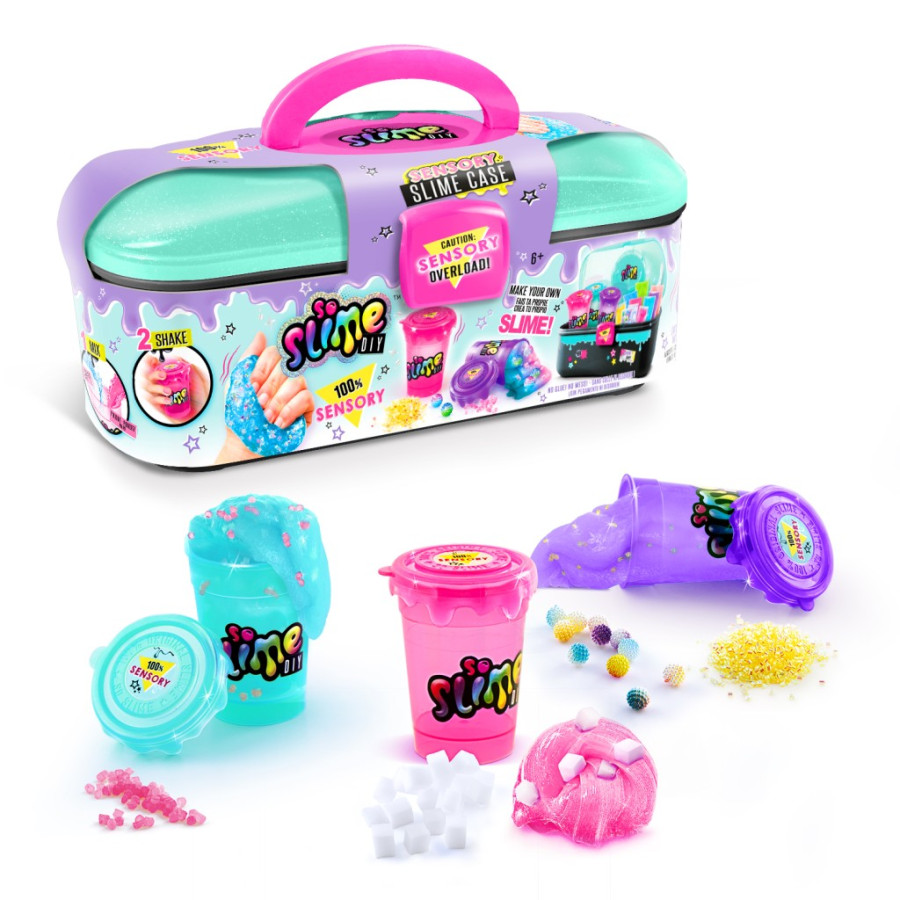 Uvnitř kufříku najdete tři kelímky s už připravenými slizy v jasných barvách – fialové, tyrkysové a růžové. Kromě nich je součástí šest sáčků barevných prášků, které lze přidávat do slizu pro vytvoření různých barevných odstínů a textur. Dále balení obsahuje čtyři druhy ozdob, například malé barevné kuličky, bílé kostky, třpytivé vločky a růžové drobné kamínky, které lze do slizu vmíchat a vytvořit tak zajímavé vizuální a hmatové efekty.