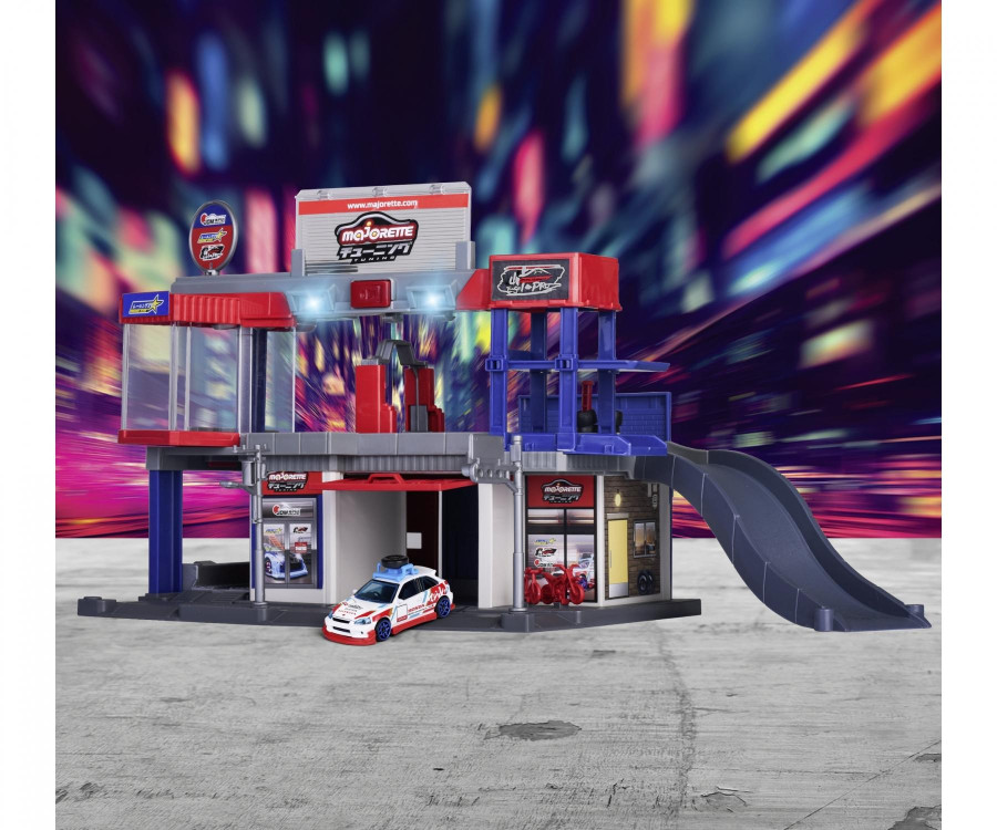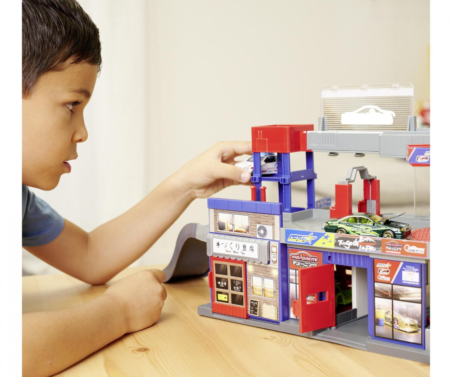 Tato dvoupatrová tuningová garáž z řady Majorette „Japan Series“, určená pro děti od 5 let, je plná funkcí. Garáž (35,5 x 45,5 x 23,5 cm) je přístupná z obou stran a je vybavena manuálním výtahem, rampou a světelnými a zvukovými efekty.