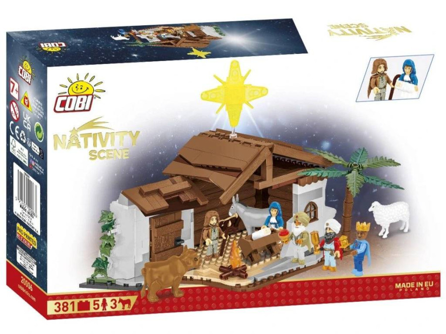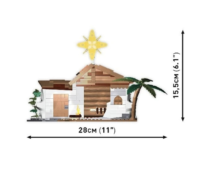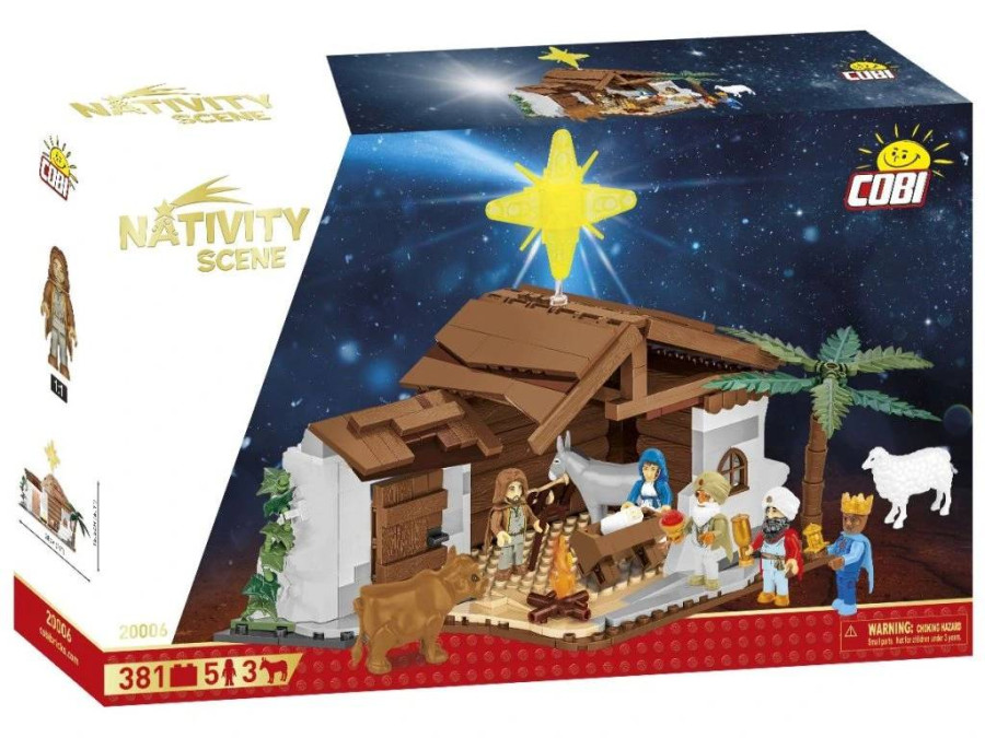 Betlému COBI nechybí charakteristické tradiční prvky. Inspirativní stavba sestávající z 381 kostek stavebnice obsahuje spoustu zajímavých rostlin, včetně břečťanu plazícího se po zdi, a palem rostoucích poblíž. Nad malou stavbou září betlémská hvězda, která přivádí mudrce z Východu. V rukou drží dary, které předají novorozenému Kristu. Kolem jsou zvířata, včetně volka, ovečky a oslíka. V samotném stáji je svatá rodina: Josef, Marie a Ježíšek.