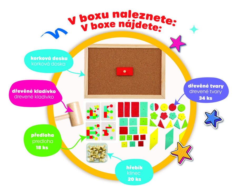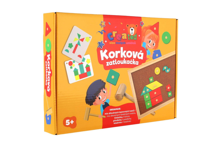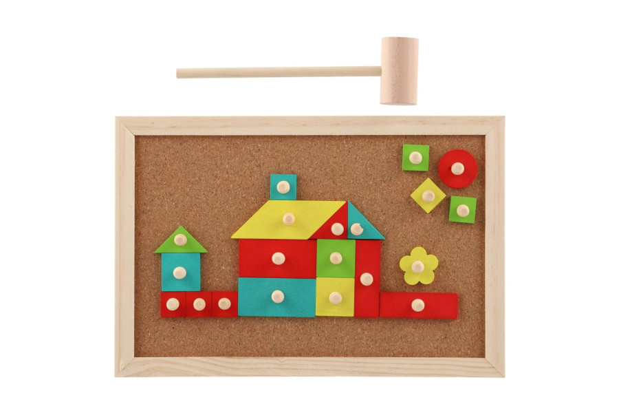 Korková zatloukačka s dřevěnými tvary, kladívkem, hřebíčky a deska z korku je výtvarná klasika, která děti nejen zabaví, ale i rozvíjí. Malí stavitelé si mohou vytvářet vlastní obrázky nebo skládat podle přiložených předloh.