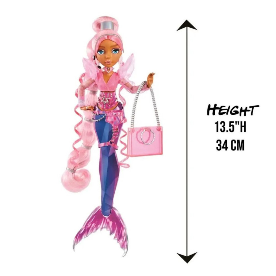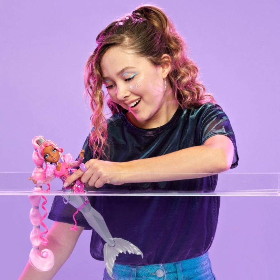 Panenka Mermaze Mermaidz™ Winter Waves™ má okouzlující ocas. Panenka má unikátní ploutev, která mění barvu, když se ponoří do ledové vody. Její ploutev se mění z lesklé růžové na přechodovou růžovou a modrou.