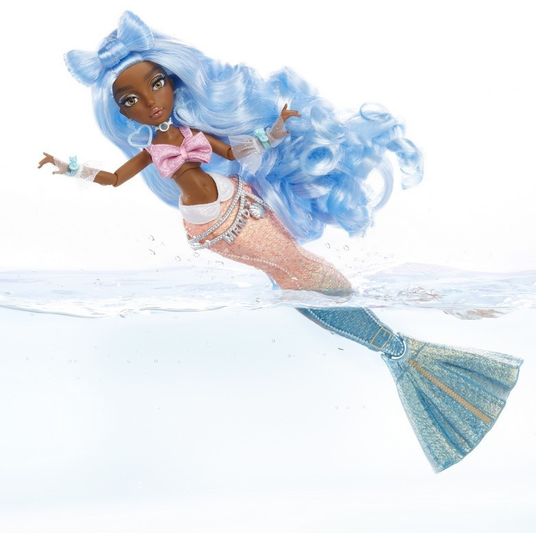 Panenka Mermaze Mermaidz™ Winter Waves™ má okouzlující ocas. Panenka má unikátní ploutev, která mění barvu, když se ponoří do ledové vody. Její ploutev se mění z lesklé růžové na přechodovou růžovou a modrou.