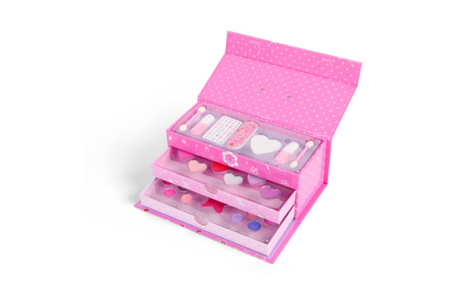 Kufřík třípatrový Beauty Create it! se zavíráním na magnet obsahuje tři patra kosmetických potřeb. První patro obsahuje 2× lak na nehty, pilník, 2× aplikátor, samolepky na nehty a tvářenku, druhé patro lesky na rty a třetí patro oční stíny a tvářenky.