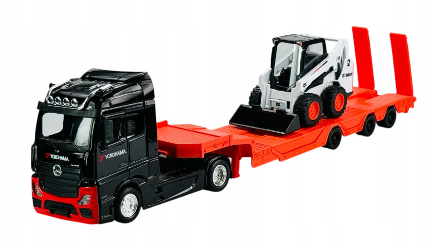 Model kamion Mercedes Benz Actros Gigaspace s přívěsem a modelem stavebnho stroje nakladačem Bobcat v měřítku 1:43 z kolekce Street Fire s vysokým důrazem na přesnost detailů.