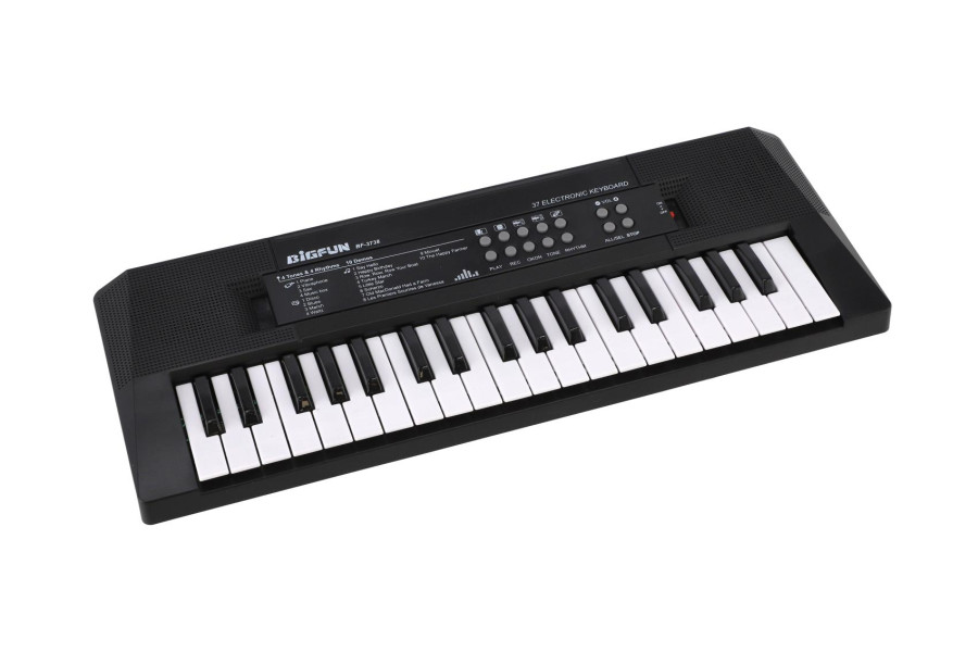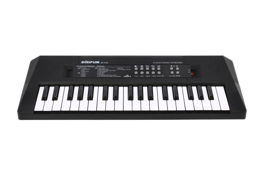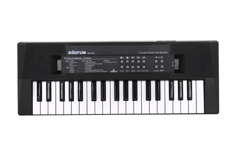 Elektronické pianko Bigfun BF-3738 pro děti s 37 klávesami nabízí spoustu zábavy pro začínající hudebníky. Obsahuje různé zvuky, rytmy i demo skladby a navíc je vybaveno mikrofonem, se kterým si děti mohou zazpívat jako skutečné hvězdy.