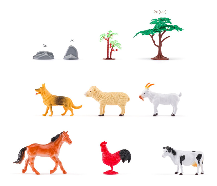 - Farma: kráva, kůň, ovce, koza, kohout, vlčák.