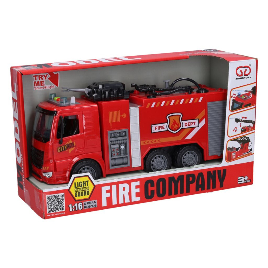 Plně funkční hasičské zásahové stříkající auto s efekty na setrvačník. Světelné a zvukové efekty, aktivace tlačítky na kabině. Nádržka na vodu se nachází uvnitř cisterny, zajištěna zátkou na střeše. Stříkání tlačítkem na nádržce.