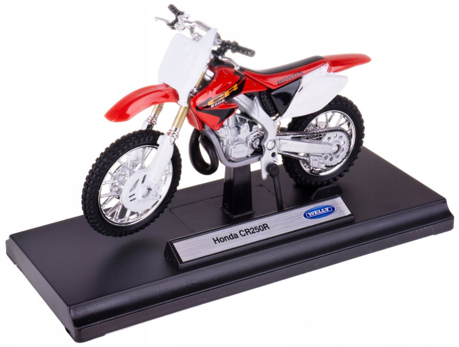 Honda CR 250 R je hezký model motorky v měřítku 1:18 vyrobený z kovových a plastových dílů. Motocykl má délku cca. 13 cm a je přišroubována na černém plastovém podstavci.