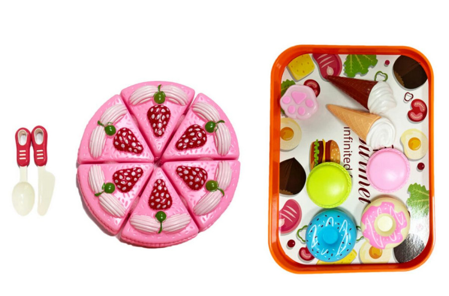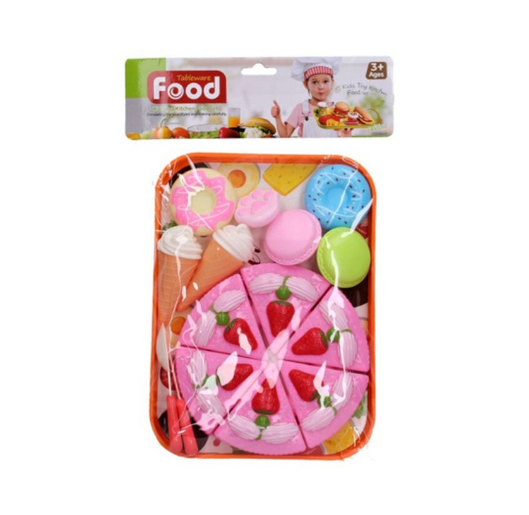 Dětský dort na krájení s příslušenstvím. Velikost 26cm. Obsahuje tácek, dort, příbor a jídlo. Hračka je vyrobena z plastu a neni vhodná pro děti do tří let věku. Jedná o hračku a neni určeno k jídlu.