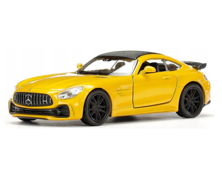 Autíčko Mercedes AMG GT R žluté barvy v měřítku 1:34/39 značky Welly s plastovým podvozkem a kovovou karoserií.