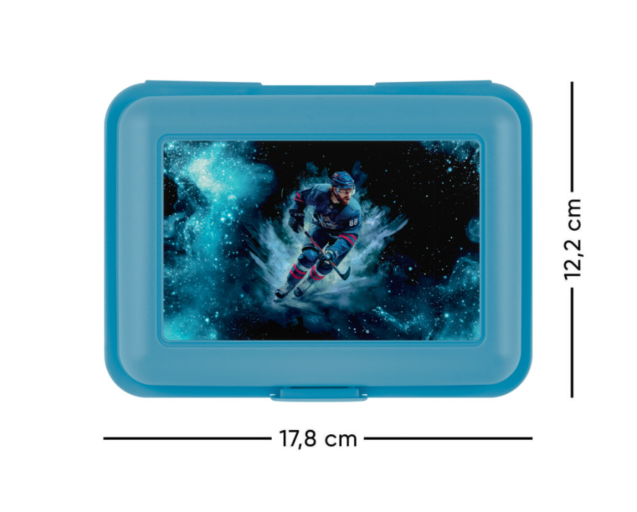 • Plastový box na svačinu v modré barvě.• Box má uzavírání na jeden zámek a obsahuje dělicí přepážku.