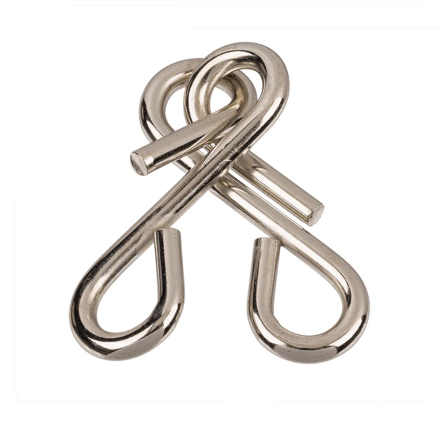 Hezky balený kovový hlavolam v retro krabičce, která se podobá balení zápalek. Balení hlavolamu obsahuje hlavolam dvojitý uzel a návod jak odělit od sebe jeho části bez použiti násilí.