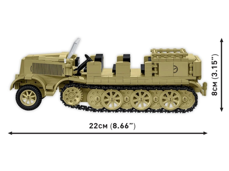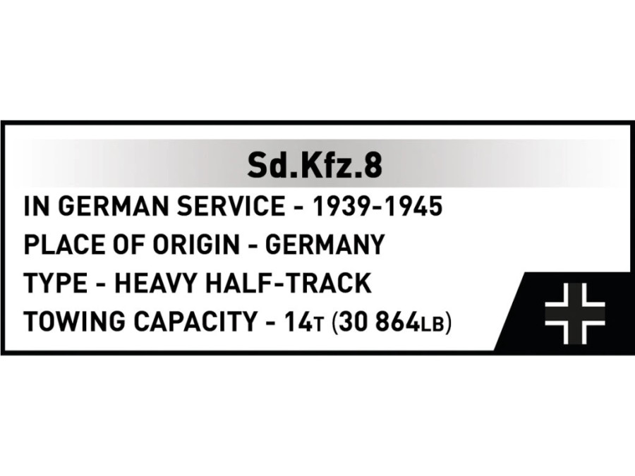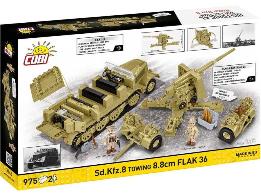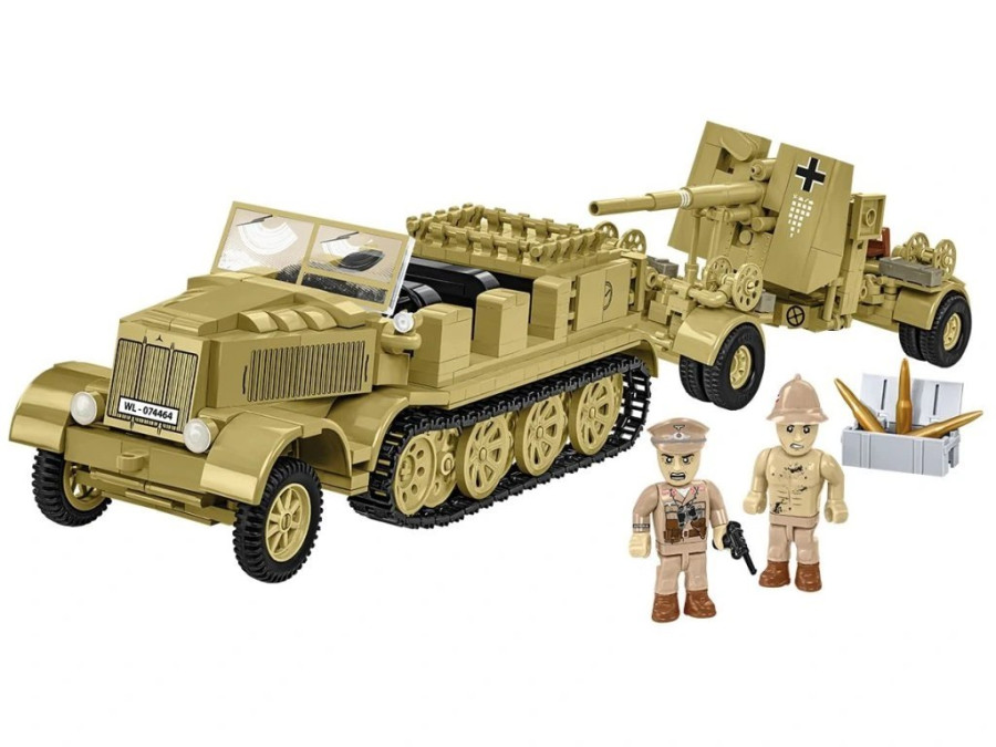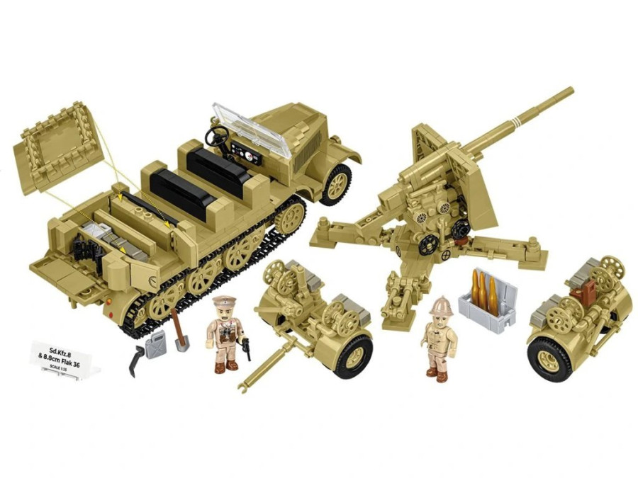 Sestavte si ze stavebnice Cobi 3143 legendární protiletadlové dělo 8,8 cm Flak 36 na přívěsu Sonderanhänger 201 a mohutný polopásový dělostřelecký tahač Sd.Kfz. 8, uzpůsobený pro náročné podmínky pouště.