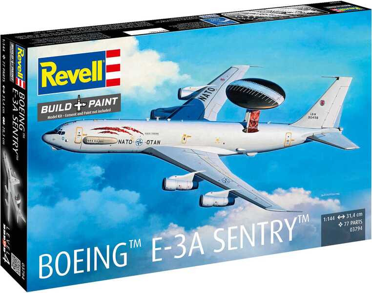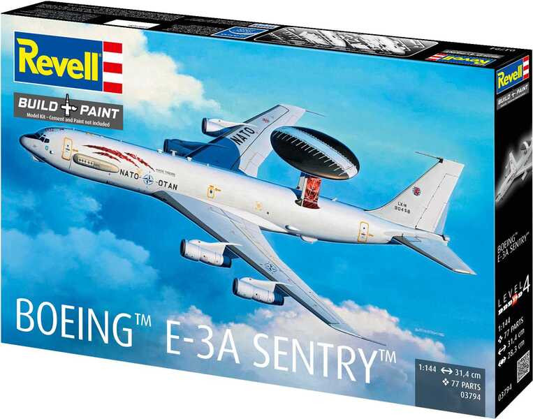 Stavebnice Revell 03794 letadla Boeing E-3A ke slepeníí v měřítku 1:144. Balení obsahuje 77 dílků ke slepení.
