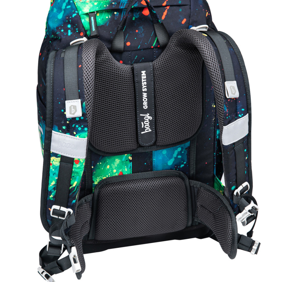 • Ergonomicky tvarovaná záda doplňují plně nastavitelné ramenní popruhy s prodyšným polstrováním, odnímatelný bederní pás a hrudní popruh, které zaručují maximální komfort, stabilitu a správné rozložení zátěže na dětských zádech.