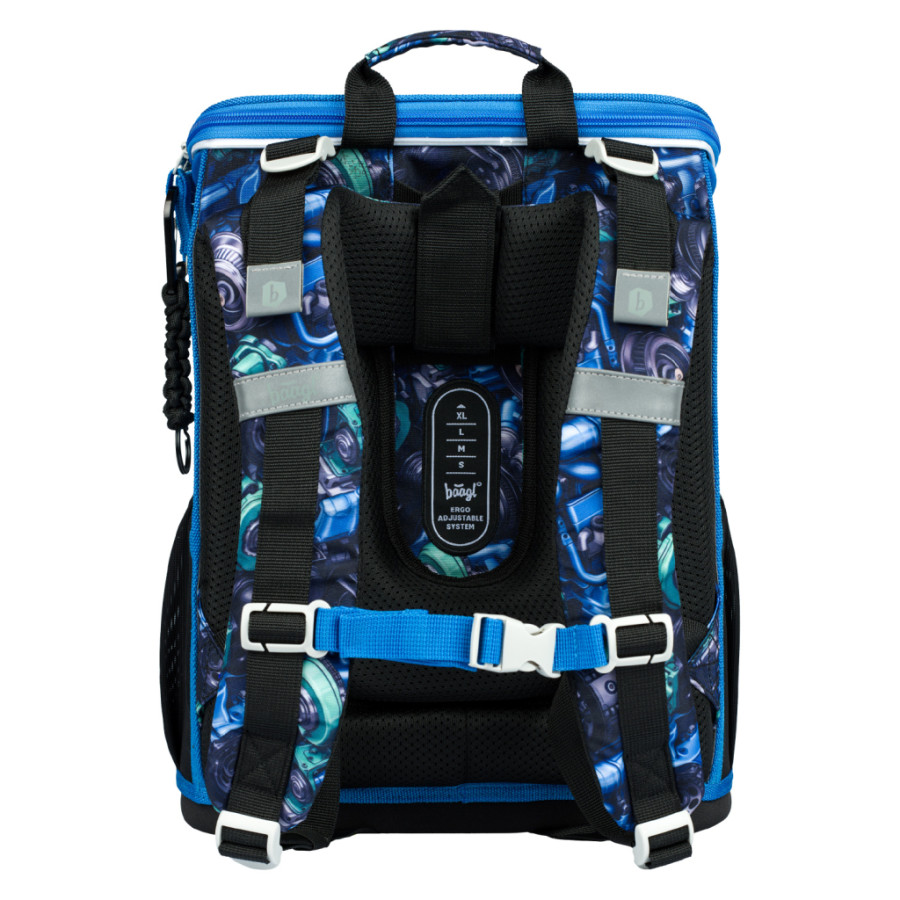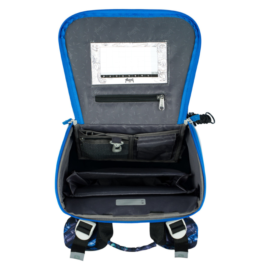 • Uvnitř aktovky je průhledná kapsa na rozvrh a vnitřní organizér umožňující rovnoměrné rozložení hmotnosti, doplněný gumičkou pro fixaci.