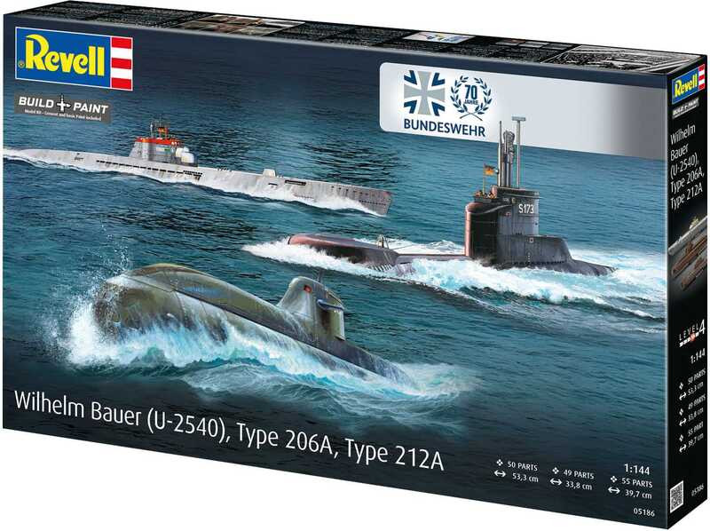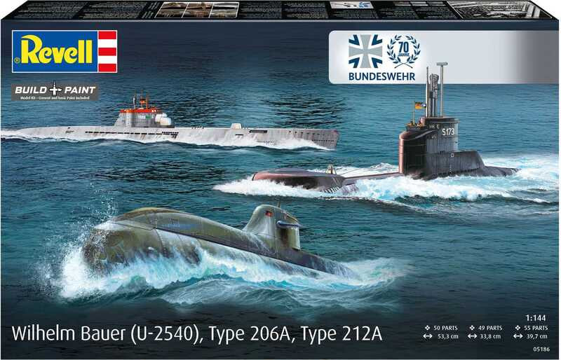 Modely ponorek ke slepení ze stavebnice Revell v měřítku 1:144 o vrlikosti ponorek 53,3 cm + 33,8 cm + 39,7 cm. Balení obsahuje 154 dílků ke slepení.