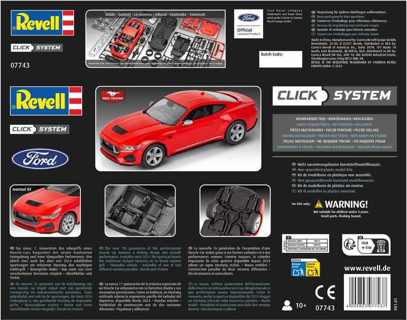 Revell EasyClick auto 07743 - 2024 Ford Mustang GT je zacvakávací model auta v měřítku 1:24. Model mám po sestavení na délku 19,3 cm.