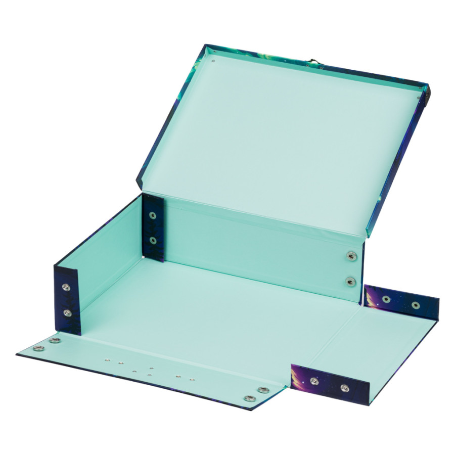 • Díky důmyslnému systému patentek lze kufřík s okovanými rohy snadno složit i rozložit během několika vteřin.