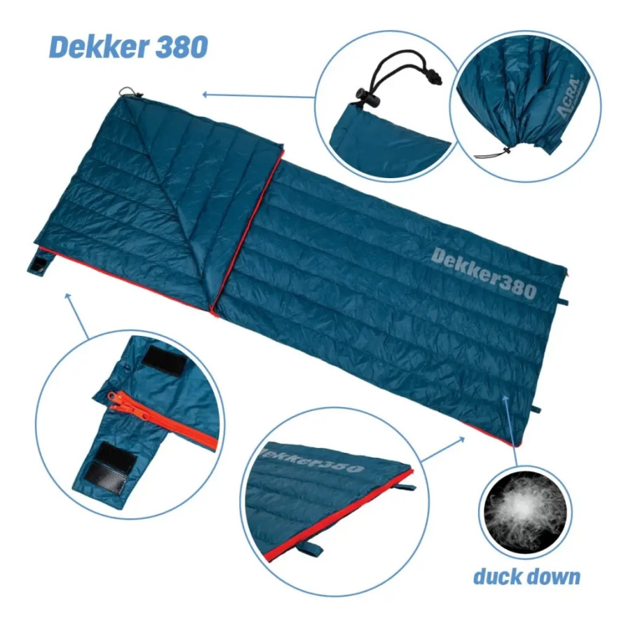 Acra Dekker380 je ideální spací pytel pro všechny, kdo hledají lehký, skladný a zároveň velmi komfortní spacák pro kempování, karavaning, turistiku, spaní na chatě nebo letní outdoorové výpravy.